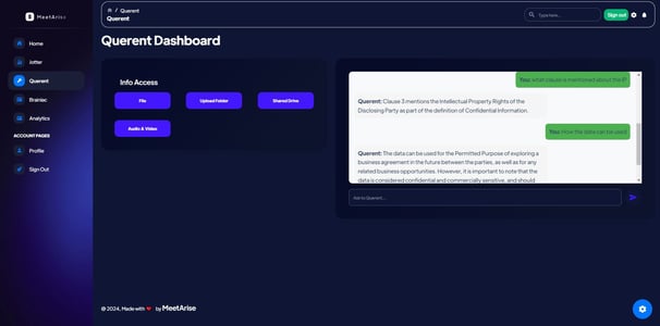Give access: Upload files or alternatively provide access to folders and shared drives to have interactive insights and guidance. Interact: Querent will provide answers, solutions or recommendation tailored to the users input questions.