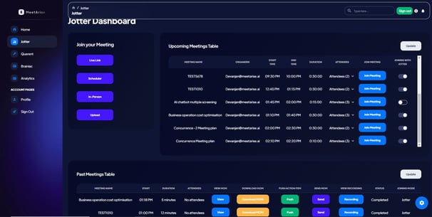 Choose your Channel: Add Jotter to transcribe your meetings from MS Teams, Google Meet, WebEx, Skype, Telephone, Audio or even using mic when in-person. Sync your Calendar: Jotter joins automatically during the meeting. Generate Action items: Once the meeting ends or Jotter is removed the action items, meeting summary and MoM is generated which can pushed to Jira, Asana other project management, CRM & ERP tools. Analyze and Report: Dive deep into insights from your meeting with inbuilt analytics and share the reports to stakeholders with a click of button.