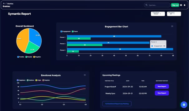 Perceive: The inbuilt model works in parallel with Jotter and understand the audio intelligence of participants. Interpret: Using vairous AI models and NLP Brainiac will analyze the conversation and interactions that includes sentiment, content, threat, health, which is then presented in the inbuilt dashboard. Reports & Analytics: The customized reports are then followed for feed forward decisions viz. training needs, sales pitch, escalation etc.